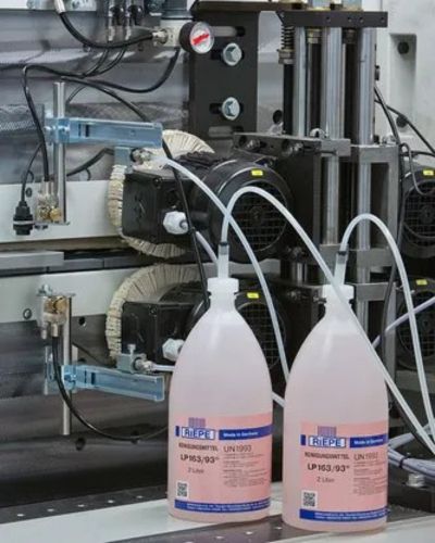This system is used to spray the Cleaning Agent LP163/93® on the top and bottom surface of the board edge, as well as the edgeband. The release agent applied at the machine infeed side and the loose glue residue are removed by the application of the cleaning agent and subsequent buffing.
